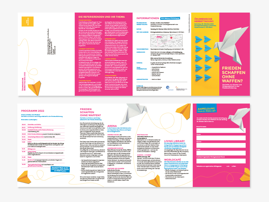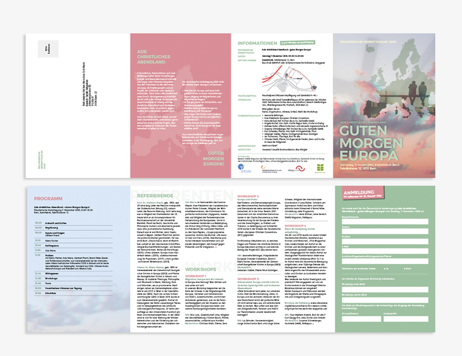Jeden Herbst veranstalten die Reformierten Kirchen Bern-Jura-Solothurn eine Herbsttagung, bei der aktuellen und oft brisanten Themen rund um die Welt zur Sprache kommen. Es finden diverse Workshops, Diskussionen und Vorführungen statt, die das gewählte Thema vertiefen und von verschiedenen Seiten her beleuchten. Neuweiss gestaltet jeweils den Flyer zu diesen Tagungen.